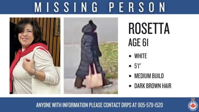 Police describe Rosetta as a 61-year-old White woman with a medium build and dark brown hair. When she was last seen, she was wearing a black toque, a long black trench-style winter coat, black pants, and black-and-white shoes. She was also carrying a light-coloured purse or tote bag.
