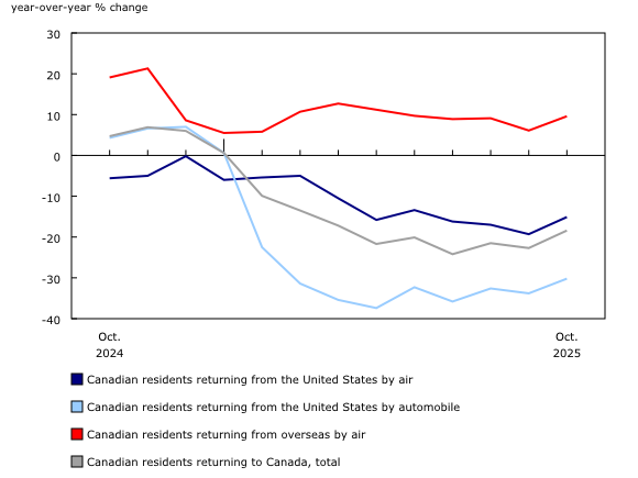 Canadian residents returning from overseas totalled 998,197 in October, up from 914,950 in October 2024.
