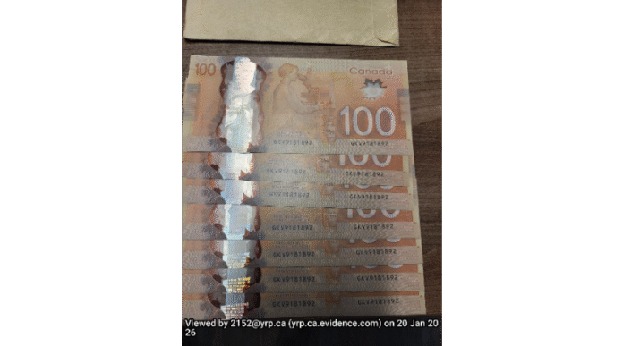 Police say the suspect was located shortly afterward and taken into custody. Officers seized seven counterfeit $100 bills, all bearing the same serial number: GKV9181892. York Regional Police also say a similar incident occurred on January 6, 2026, in Richmond Hill. That case remains under investigation.