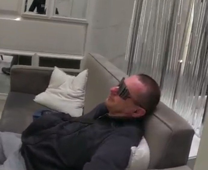 suspect ,a man wearing dark sunglasses reclines on a light-coloured couch or bed indoors, dressed in a dark jacket, with pillows and curtains visible in the background.