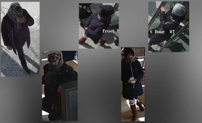 The suspects are described as follows: Suspect 1 is a male wearing a green and gray scarf over his face, a green tartan hat, a black winter coat, dark pants, and dark shoes. Suspect 2 is a female wearing a black winter jacket with a scarf covering her face and brown leg warmers. Suspect 3 is a female wearing a long black puffer coat, a gray knit hat, tan boots, a medical mask, and a dark cross-body purse.