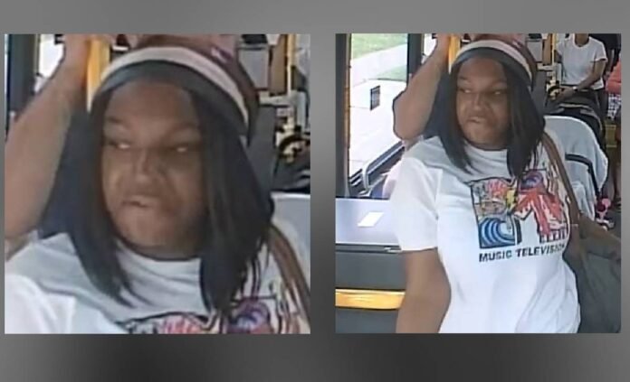 The suspect is described as a woman between 30 and 40 years old, approximately 5 feet 6 inches to 5 feet 8 inches tall, with a heavy build. She was wearing a white shirt, black tights, black-and-white Converse shoes, and a black-and-white head covering, and was carrying a green purse.